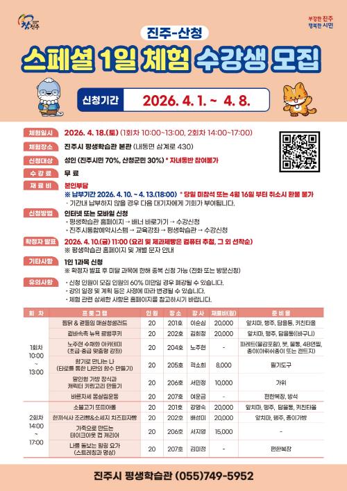 [½Åµ¿¾Æ¹æ¼Û °æ³²ÁøÁÖ=³²±Ã¿µ±â±âÀÚ] ÁøÁֽà Æò»ýÇнÀ°üÀº 4¿ù 1ÀϺÎÅÍ 8ÀϱîÁö ¡®ÁøÁÖ-»êû ½ºÆä¼È 1ÀÏ Ã¼Ç衯 ÇÁ·Î±×·¥ ¼ö°­»ýÀ» ¸ðÁýÇÑ´Ù. ¡®ÁøÁÖ-»êû ½ºÆä¼È 1ÀÏ Ã¼Ç衯Àº ÁøÁÖ½Ã¿Í »êû±ºÀÌ Çù·ÂÇØ Áö¿ª °£ÀÇ ±³·ù Ȱ¼ºÈ­¸¦ À§ÇØ ¸¶·ÃµÈ ÇÁ·Î±×·¥ÀÌ´Ù. Áö³­ 2¡¦