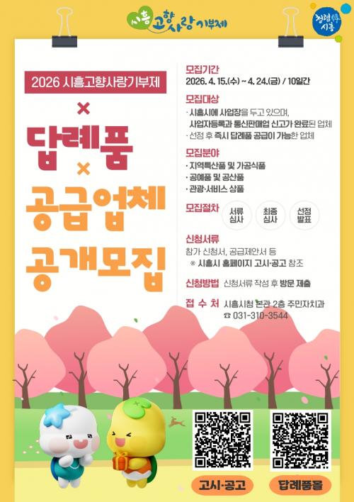 [½Åµ¿¾Æ¹æ¼Û ½ÃÈï½Ã=À̽ŵ¿±âÀÚ] ½ÃÈï½Ã´Â °íÇâ»ç¶û±âºÎÁ¦ Ȱ¼ºÈ­¿Í Áö¿ª Ư»öÀ» ¹Ý¿µÇÑ ´ä·Êǰ ¹ß±¼À» À§ÇØ ¡®2026³â °íÇâ»ç¶û±âºÎÁ¦ ´ä·Êǰ ¹× °ø±Þ¾÷ü¡¯¸¦ °ø°³ ¸ðÁýÇϸç 4¿ù 15ÀϺÎÅÍ 24ÀϱîÁö 10Àϰ£ ½Åû¤ýÁ¢¼ö¸¦ ¹Þ´Â´Ù. ¸ðÁý ´ë»óÀº °ø°íÀÏ ±âÁØ ½ÃÈï½Ã¿¡ »ç¡¦