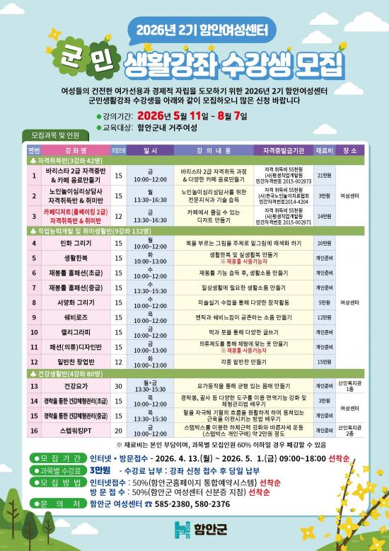 [½Åµ¿¾Æ¹æ¼Û °æ³²ÇÔ¾È=À̽ŵ¿±âÀÚ] ÇԾȱºÀº ±º¹ÎÀÇ ÀÚ±â°è¹ß°ú ¿©¼ºÀÇ °æÁ¦È°µ¿ Áö¿øÀ» À§ÇØ ¡®2026³â 2±â ÇԾȱº¿©¼º¼¾ÅÍ ±º¹Î»ýȰ°­Á¡¯ ¼ö°­»ýÀ» ¸ðÁýÇÑ´Ù°í 6ÀÏ ¹àÇû´Ù. À̹ø °­Á´ ¿À´Â 5¿ù 11ÀϺÎÅÍ 8¿ù 7ÀϱîÁö 12ÁÖ°£ ¿î¿µµÇ¸ç, ÃÑ 16°³ °­Á·Π±¸¼ºµÈ´Ù¡¦