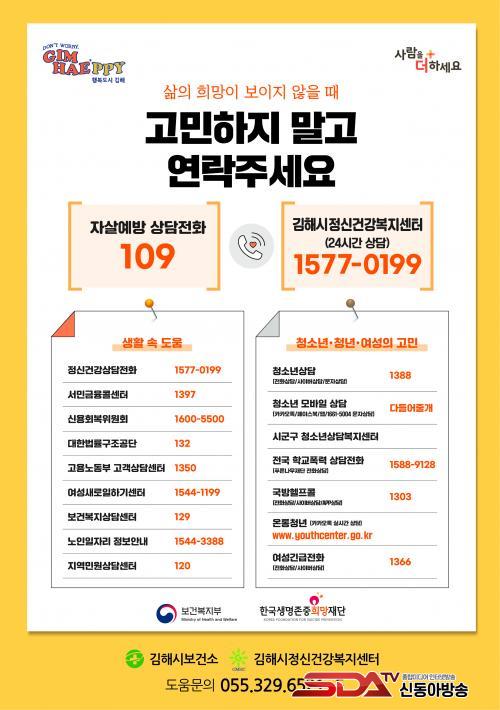 ÇÑÆí ¿ì¿ï°¨ µî ¸»Çϱ⠾î·Á¿î °í¹ÎÀÌ Àְųª ÁÖº¯¿¡ ÀÌ·± ¾î·Á¿òÀ» °Þ´Â °¡Á·¡¤ÁöÀÎÀÌ ÀÖÀ» °æ¿ì Àڻ쿹¹æ»ó´ã ÀüÈ­ ¢Ï109, Á¤½Å°Ç°­ »ó´ãÀüÈ­ ¢Ï1577-0199, Èñ¸ÁÀÇ ÀüÈ­ ¢Ï129, û¼Ò³â »ó´ã ¢Ï1388·Î ¿¬¶ôÇϸé 24½Ã°£ Àü¹®°¡ »ó´ãÀ» ¹ÞÀ» ¼ö ÀÖ´Ù. ÁÖ°£Àº ±èÇØ½ÃÁ¤½Å°Ç°­º¹Áö¼¾ÅÍ(055-329-6521~5)·Î ¿¬¶ôÇÏ¸é µÈ´Ù.
