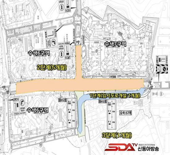 °ø»ç´Â ÃÑ 3´Ü°èÀÇ °úÁ¤À¸·Î ÁøÇàµÈ´Ù. 1´Ü°è °ø»ç´Â ¼ö»ö8±¸¿ª ³» ÀϺΠ°ÇÃ๰À» ö°ÅÇØ 250m ¿¬ÀåÀÇ ¿Õº¹ 2Â÷¼± ¿ìȸµµ·Î¸¦ °³¼³ÇÑ´Ù.