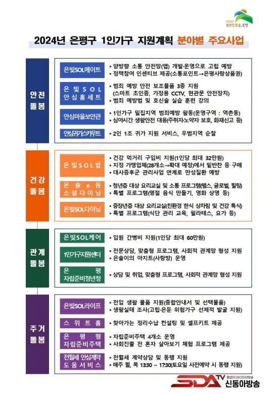 ¹üÁË ¾ÈÀü ȯ°æ Á¶¼ºÀ» À§ÇØ ÀººûSOL¾È½ÉȨ¼¼Æ®, ¾È½É¸¶À»º¸¾È°ü, ¾È½É±Í°¡ ½ºÄ«¿ìÆ® µî »ç¾÷°ú ÁÖ°Å ¾ÈÁ¤ Áö¿øÀ» À§ÇØ, Àü¿ù¼¼ ¾È½É°è¾à µµ¿ò¼ºñ½º, ½ºÀ§Æ®È¨ µî »ç¾÷À» ÃßÁøÇÑ´Ù. °Ç°ÇÑ ½Ä»ýȰ ¹× Á¤¼Àû ¾ÈÁ¤À» À§ÇÑ ¿ä¸®±³½Ç ¹× ¼ÒÅë ÇÁ·Î±×·¥Àº û³âÃþ Àº¼ÖeÀ½ ¼Ò¼È´ÙÀÌ´×, ÁßÀå³âÃþ ÀººûSOL´ÙÀÌ´×À¸·Î Âü¿© ´ë»ó°ú ³»¿ëÀ» ±¸ºÐÇØ ¿î¿µÇÑ´Ù.