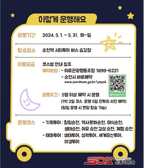 ÇÑÆí, 5¿ù 4~6ÀÏ ¾î¸°À̳¯ ¿¬ÈÞ¿¡´Â ÈÞ¹« ¾øÀÌ ¿îÇàÇÑ´Ù. ¼øÃµ½ÃƼÅõ¾î ÀÌ¿ë¿ä±Ý, ¿îÇàÄÚ½º µî »ó¼¼ ³»¿ë È®Àΰú ¿Â¶óÀÎ ¿¹¾àÀº ¼øÃµ½Ã ¹Ù·Î¿¹¾à(www.suncheon.go.kr/yeyak)¿¡¼ °¡´ÉÇÏ´Ù.