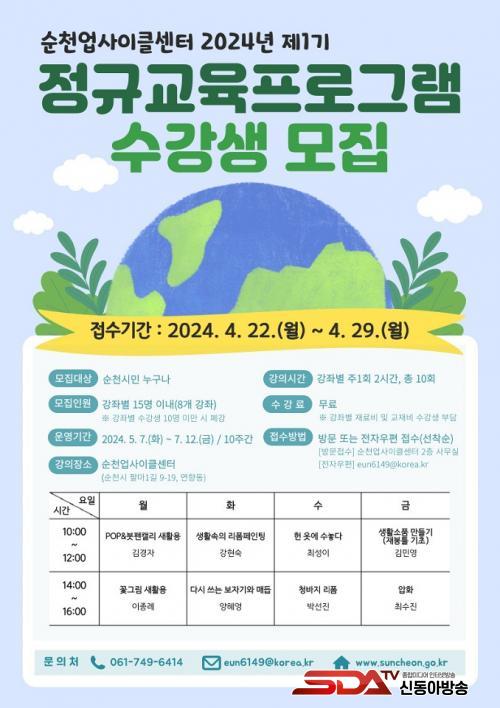 Âü°¡¸¦ Èñ¸ÁÇÏ´Â ¼øÃµ½Ã¹ÎÀº ¿À´Â 29ÀϱîÁö ¾÷»çÀÌŬ¼¾ÅÍ ¹æ¹® ¶Ç´Â ÀüÀÚ¿ìÆíÀ¸·Î ½ÅûÇÏ¸é µÈ´Ù. ¼ö°·á´Â ¹«·áÀ̸ç, °Áº° Àç·áºñ ¹× ºÎÀÚÀçºñ´Â ¼ö°»ýÀÌ ºÎ´ãÇÏ¿©¾ß ÇÑ´Ù.