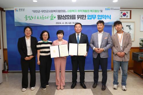 À̳¯ Çù¾à½Ä¿¡´Â ±è»ê ±º¼ö, ³ª¹ÎÈñ ¹«¾È±º»çȸº¹ÁöÇùÀÇȸÀå µî µÎ ±â°üÀÇ °ü°èÀÚ°¡ Âü¼®ÇÏ¿© ¹°¸ÂÀÌ Ä¡À¯ÀÇ ½£¿¡¼ »çȸº¹Áö Ãë¾à°èÃþ¿¡ ¼öÁØ ³ôÀº º¹Áö¼ºñ½º¸¦ Á¦°øÇϱâ À§ÇØ ±³·ù ¹× Çù·ÂÀ» Çϱâ·Î »óÈ£ ¾à¼ÓÇß´Ù.