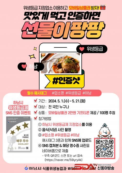 Çϳ²½Ã´Â À½½ÄÁ¡ À§»ýµî±ÞÁ¦ È«º¸ ¹× ÀÌ¿ëȰ¼ºÀ» À§ÇØ À½½ÄÁ¡ À§»ýµî±ÞÀ» ¹ÞÀº ¸ÅÀåÀ» Á÷Á¢ ¹æ¹®Çϰųª ¹è´ÞÀ» ÅëÇØ ÀÌ¿ëÇÑ ÈÄ SNS¿¡ ÀÎÁõÇϸé 100¸íÀ» ÃßÃ·ÇØ 2¸¸¿ø »ó´çÀÇ ¸ð¹ÙÀÏ »óǰ±ÇÀ» Á¦°øÇÒ ¿¹Á¤ÀÌ´Ù.