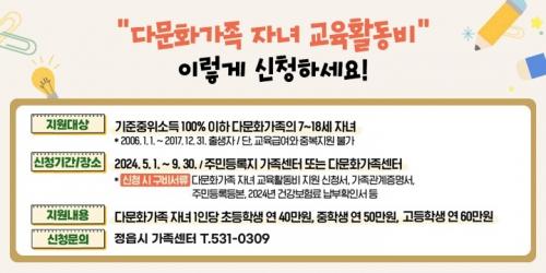¿ÃÇØ óÀ½ ½ÃÇàÇÏ´Â ±³À° Ȱµ¿ºñ Áö¿ø»ç¾÷Àº ±³À° ±Þ¿©(ÁßÀ§¼Òµæ 50% ÀÌÇÏ)¸¦ ¹ÞÁö ¾Ê´Â ±âÁØÁßÀ§¼Òµæ 100% ÀÌÇÏ ´Ù¹®È°¡Á·ÀÇ 7~18¼¼ ÀÚ³à(2006³â 1¿ù 1ÀÏ~2017³â 12¿ù 31ÀÏ Ãâ»ý)¿¡°Ô ±³Àç ±¸ÀÔ, µ¶¼½Ç ÀÌ¿ë µî ±³À°È°µ¿¿¡ ÇÊ¿äÇÑ ºñ¿ëÀ» Ä«µåÆ÷ÀÎÆ® Çü½ÄÀ¸·Î ¹ÞÀ» ¼ö ÀÖ´Ù.