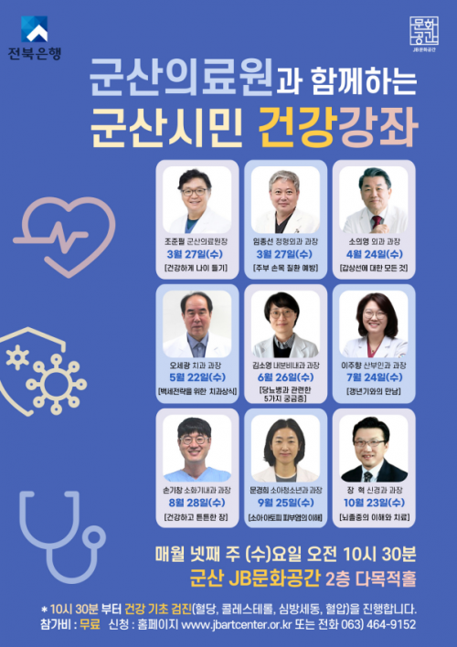 ¡®±º»êÀÇ·á¿ø°ú ÇÔ²²ÇÏ´Â ±º»ê½Ã¹Î °Ç°°Á¡¯´Â ¸Å¿ù 1ȸ ½Ç½ÃÇϸç, ¸Å´Þ ³Ý° ÁÖ ¼ö¿äÀÏ ¿ÀÀü 11½ÃºÎÅÍ 12½Ã±îÁö ÇÑ ½Ã°£ µ¿¾È ´Ù¾çÇÑ ÁÖÁ¦·Î ¹«·á °Ç°°Á¸¦ ÁøÇàÇÑ´Ù.