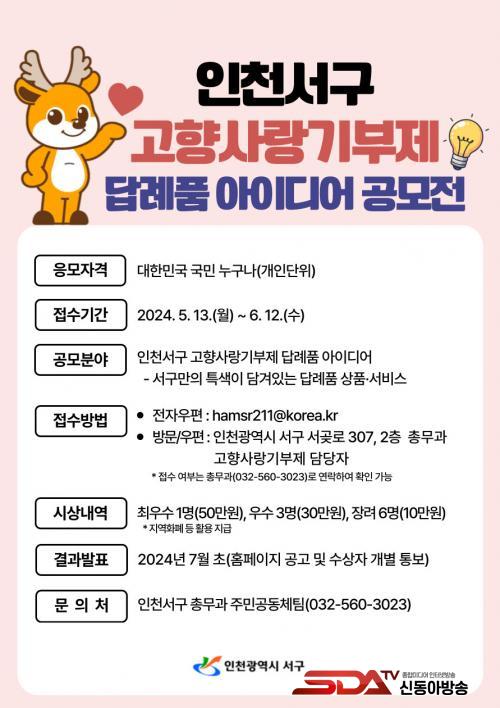 °ø¸ðÁÖÁ¦´Â ¼±¸¸¸ÀÇ Æ¯»öÀÌ ´ã°ÜÀÖ°í ǰÁúÀÌ ¿ì¼öÇÑ °íÇâ»ç¶û±âºÎÁ¦ ´ä·Êǰ »óǰ¡¤¼ºñ½º¿¡ ´ëÇÑ ¾ÆÀ̵ð¾î ¹ß±¼ÀÌ´Ù. °ø¸ð ±â°£Àº 5¿ù 13ÀϺÎÅÍ 6¿ù 12ÀϱîÁöÀ̸ç ÀÎõ¼±¸ °íÇâ»ç¶û±âºÎÁ¦¿¡ °ü½ÉÀÌ ÀÖ´Â Àü ±¹¹Î ´©±¸³ª ÀÀ¸ð °¡´ÉÇÏ°í ¿ìÆí¡¤ÀüÀÚ¿ìÆí¡¤Á÷Á¢ ¹æ¹®À» ÅëÇØ Á¢¼öÇÒ ¼ö ÀÖ´Ù.
