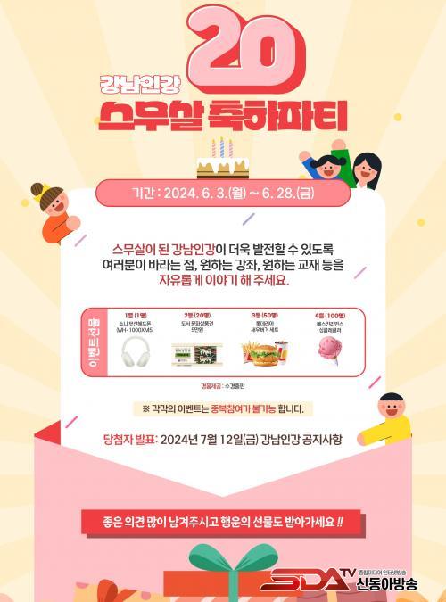 À̹ø ÃàÇÏÀ̺¥Æ®´Â 6¿ù 3ÀϺÎÅÍ 28ÀϱîÁö °³²Àΰ ȨÆäÀÌÁö(edu.ingang.go.kr)¿¡¼ Âü¿©ÇÒ ¼ö ÀÖ´Ù. °³²Àΰ ½º¹«»ì ÃàÇÏÆÄÆ¼´Â ȨÆäÀÌÁö À̺¥Æ® °Ô½ÃÆÇ¿¡ °³²Àΰ¿¡ ¹Ù¶ó´Â Á¡, ¿øÇÏ´Â °ÁÂ¿Í ±³Àç µîÀ» ÀÚÀ¯·Ó°Ô ¾²´Â À̺¥Æ®´Ù.