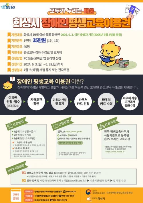 À̹ø °ø¸ð¼±Á¤¿¡ µû¶ó È­¼º½Ã ³» 19¼¼ ÀÌ»ó µî·Ï Àå¾ÖÀÎ 40¸íÀº 1ÀÎ´ç ¿¬°£ 35¸¸¿ø(¿ì¼ö ÀÌ¿ëÀÚ ÃÖ´ë 70¸¸¿ø)ÀÇ Æò»ý±³À°ÀÌ¿ë±ÇÀ» ¹Þ¾Æ µî·ÏµÈ Æò»ý±³À°±â°üÀÇ ÇÁ·Î±×·¥À» ¼ö°­ÇÒ ¼ö ÀÖ°Ô µÆ´Ù.