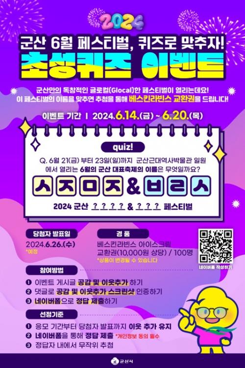 À̹ø À̺¥Æ®´Â ¡®±º»ê 6¿ù ´ëÇ¥ Æä½ºÆ¼¹ú, ÄûÁî·Î ¸ÂÃßÀÚ! ÃʼºÄûÁî À̺¥Æ®¡¯·Î 6¿ù 21ÀϺÎÅÍ 23ÀϱîÁö 3Àϰ£ ±Ù´ë¿ª»ç¹Ú¹°°ü ÀÏ¿ø¿¡¼­ ¿­¸®´Â ÃàÁ¦ À̸§À» ¸ÂÃß¸é µÈ´Ù.