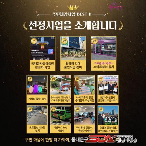 ¡®ÁÖ¹Îü°¨ BEST 11¡¯ ¼±Á¤°á°ú ¹× 1~110À§±îÁö »ç¾÷º° ¼¼ºÎ³»¿ªÀº 12ÀÏ(¼ö) ¿ÀÈĺÎÅÍ µ¿´ë¹®±¸ ´©¸®Áý(ddm.go.kr)¿¡¼ È®ÀÎÇÒ ¼ö ÀÖ´Ù