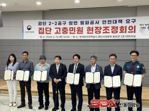 ÀÎõ ¼­±¸¸¦ ºñ·ÔÇÑ 4°³ ±â°üÀÌ ÇÕÀÇÇÑ À̹ø Á¶Á¤ ÇùÀÇ´Â, °Ë´Ü½Åµµ½Ã ºÒ·Îµ¿ °ø»ç ÇöÀå¿¡¼­ ¹ß°ßµÈ ´ë±Ô¸ð ¾Ï¹ÝÀÇ ¹ßÆÄ ¹®Á¦ ÇØ°áÀ» À§ÇØ ½ÃÀ۵ƴÙ. ÁöÇÏ ¾Ï¹ÝÀº °¡·Î 80m, ¼¼·Î 130m, ³ôÀÌ 26mÀÇ ±Ô¸ðÀ̸ç, ¾Ï¹ÝÀ¸·ÎºÎÅÍ 80m Àαٿ¡ ÁÖ°Å´ÜÁö°¡ ÀÎÁ¢ÇØ ÀÖ¾î, ¹ßÆÄ·Î ÀÎÇÑ ¼ÒÀ½, Áøµ¿, ¾ÈÀü¼º µîÀÇ ¹®Á¦°¡ ´ëµÎµÇ¾ú´Ù. ±×µ¿¾È ÇöÀå Àα٠2,600¿© ¼¼´ëÀÇ Áö¿ª ÁֹεéÀº ºñ´ëÀ§¸¦ ±¸¼ºÇß°í, Çѱ¹ÅäÁöÁÖÅðø»ç. ¼­±¸Ã» µî °ü°è ±â°üµé°ú ±¼Âø °ø¹ý°ú ÁֹΠºÒÆí »çÇ× µî¿¡ ´ëÇØ, »óÈ£ ÇùÀÇÇÑ ³¡¿¡ À̹ø¿¡ ÇÕÀÇ¿¡ À̸£°Ô µÆ´Ù.