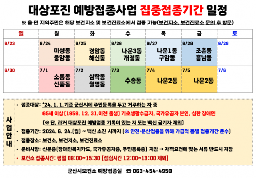 ÀÌ¿¡ µû¶ó, ±º»ê½Ã´Â Ãë¾à°èÃþÀÇ °æÁ¦Àû ºÎ´ã °æ°¨ ¹× Áúº´ ¿¹¹æÀ» À§ÇØ 2024³â 1¿ù 1ÀÏ ±âÁØ ±º»ê½Ã¿¡ Áֹεî·ÏÀ» µÐ 65¼¼(1959³â 12¿ù 31ÀÏ ÀÌÀü Ãâ»ýÀÚ) ÀÌ»ó Áß ±âÃÊ»ýȰ¼ö±ÞÀÚ, Àå¾ÖÀÇ Á¤µµ°¡ ½ÉÇÑ Àå¾ÖÀÎ, ±¹°¡À¯°øÀÚ º»ÀÎÀ» ´ë»óÀ¸·Î 1ȸ ¹«·á Á¢Á¾À» ÃßÁøÇÑ´Ù.