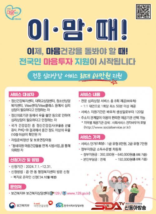 ¡®Àü±¹¹Î ¸¶À½ÅõÀÚ Áö¿ø¡¯Àº ±¹¹ÎÀÇ ¸¶À½ °Ç° µ¹º½Àº ¹°·Ð ÀÚ»ì ¿¹¹æ ¹× Á¤½ÅÁúȯ Á¶±â ¹ß°ßÀ» À§ÇØ ¿ì¿ï, ºÒ¾È µî Á¤¼Àû ¾î·Á¿òÀÌ ÀÖ´Â ±¹¹Î¿¡°Ô ½É¸®»ó´ã ¼ºñ½º¸¦ Áö¿øÇÏ´Â »ç¾÷ÀÌ´Ù.