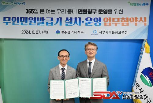[½Åµ¿¾Æ¹æ¼Û=ÀÌÁöÇö±âÀÚ] ±¤ÁÖ±¤¿ª½Ã ¼­±¸(±¸Ã»Àå ±èÀ̰­)¿Í »ó¹«»õ¸¶À»±Ý°í(ÀÌ»çÀå ±è¿ùÃâ)°¡ ÁֹεéÀÇ ¹Î¿ø ÆíÀÇ ÁõÁøÀ» À§ÇØ ¼ÕÀ» ¸ÂÀâ¾Ò´Ù. ¾ç ±â°üÀº 27ÀÏ »ó¹«»õ¸¶À»±Ý°í º»Á¡ ³» ¹«Àιοø¹ß±Þ±â¸¦ ½Å±Ô ¼³Ä¡Çϰí, »óÈ£ Çù·Â°ü°è¸¦ ¹ÙÅÁÀ¸·Î È¿À²ÀûÀÎ ¿î¿µÀ» À§ÇØ ¾÷¹«Çù¾àÀ» ü°áÇß´Ù.