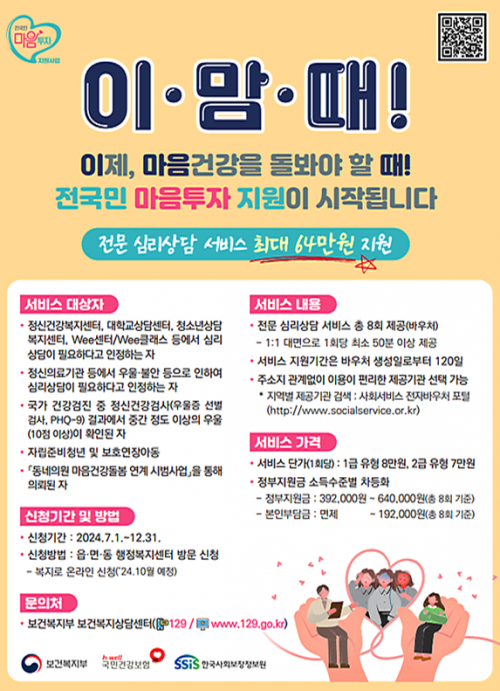 ¼ºñ½º ´ë»óÀÚ·Î °áÁ¤µÇ¸é 1:1 ´ë¸é ½É¸®»ó´ã ¼ºñ½º¸¦ 8ȸ ¹ÞÀ» ¼ö ÀÖ´Â ¹Ù¿ìó°¡ Á¦°øµÈ´Ù. ´ë»óÀÚ´Â °ÅÁÖÁö¿Í »ó°ü¾øÀÌ ¼ºñ½º Á¦°ø±â°üÀ» ¼±ÅÃÇÑ ÈÄ ¼Òµæ¼öÁØ¿¡ µû¸¥ º»Àκδã±ÝÀ» ³³ºÎÇϰí ÀÌ¿ëÇÒ ¼ö ÀÖ´Ù.