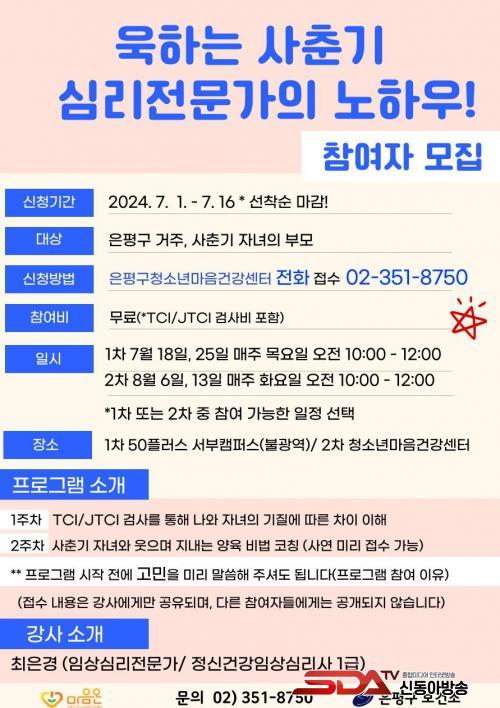 ¼¾ÅÍ´Â ¿À´Â 18ÀϺÎÅÍ ¡®¿íÇÏ´Â »çÃá±â ½É¸®Àü¹®°¡ÀÇ ³ëÇϿ졯¸¦ ÁÖÁ¦·Î ¸¶À½°Ç° ÇÁ·Î±×·¥À» ¿î¿µÇÑ´Ù. »çÃá±â ÀÚ³à¿ÍÀÇ °Ç°ÇÑ ¼ÒÅë ¹æ¹ý¿¡ °üÇØ »çÃá±â Àڳฦ µÐ ºÎ¸ð¿Í °øÀ¯ÇϰíÀÚ ÇÑ´Ù. ºÎ¸ð¿Í ÀÚ³à ¼º°Ý, ±âÁú°Ë»ç(TCI/JTCI)µµ ¹«·á·Î ÁøÇàµÈ´Ù.