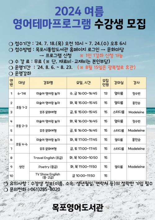¼ºÀÎ ´ë»óÀ¸·Î ÇØ¿Ü¿©Çà Áß¿¡ ¾²´Â ¿µ¾î Ç¥ÇöÀ» ¹è¿ì´Â ¡°¿©Çà ¿µ¾î¡±, ÀÛǰÀ» °¨»óÇÏ¸ç ¿µ¹Ì±Ç ¹®ÇÐÀ» Á¢ÇÏ´Â ¡°¿µ¹Ì ½Ã¡±, TV ÇÁ·Î±×·¥À» º¸¸ç ½Ç»ýȰ¿¡¼ ¾²´Â ¿µ¾îÇ¥Çö°ú ¹®È¸¦ ¹è¿ì´Â ¡°TV¼î ¿µ¾î¡± µî 3°³ÀÇ °Á¸¦ ¿î¿µÇÑ´Ù.