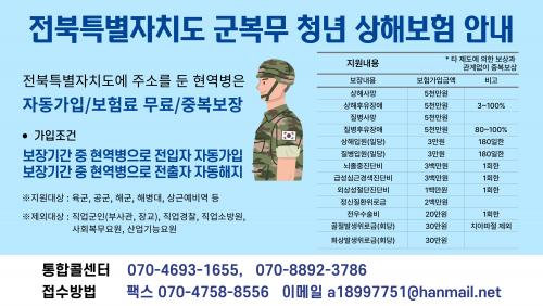 ÀÌ º¸ÇèÀº ±ºº¹¹« Áß(ÈÞ°¡, ¿ÜÃâ Æ÷ÇÔ) »ç¸Á, »óÇØ, Áúº´, ÈÄÀ¯Àå¾Ö µîÀÌ ¹ß»ýÇÒ °æ¿ì Ä¡·á µîÀ» À§ÇØ Áö¿øµÇ¸ç, »ç°íÀϷκÎÅÍ 3³â°£ À¯È¿ÇÏ´Ù. Çå¹ý»ó ±¹¹ÎÀÇ Àǹ« Áß ÇϳªÀÎ ±¹¹æÀÇ Àǹ«¸¦ ¼öÇàÇϴ û³âÀ» µÎÅÓ°Ô º¸È£Çϱâ À§ÇØ, ±¹¹æºÎÀÇ 'º´»óÇØº¸Çè' µî°úµµ Áߺ¹ º¸ÀåÀÌ °¡´ÉÇÏ´Ù. ´Ù¸¸, ¼Ò¼Ó±â°ü ´Üüº¸ÇèÀÌ °¡ÀԵǴ »çȸº¹¹«¿ä¿ø, Á÷¾÷±ºÀÎÀº µîÀº °¡ÀÔ ´ë»ó¿¡¼ Á¦¿ÜµÈ´Ù.