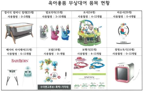 ¶ÇÇÑ, ±èÁ¦½Ã °ÅÁÖ Ãâ»ê°¡Á¤ÀÇ ¿µ¾Æ(0~12°³¿ù)´Â À°¾Æ¿ëǰ ¹× À¯Ãà±â¸¦ ¹«»óÀ¸·Î ´ë¿©ÇÒ ¼ö ÀÖ´Ù. À°¾Æ¿ëǰÀº 1ÀÎ 1ǰ¸ñ ¿¬ ÃÖ´ë 9°³¿ùµ¿¾È ´ë¿©°¡ °¡´ÉÇϸç, Á¢ÀÌ½Ä Ä§´ë, ¸ðºô, ½î¼­, ¹Ù¿î¼­, º¸Çà±â µî ÃÑ 14Á¾ÀÌ´Ù. À¯Ãà±â ¹× ¸ðÀ¯ÆÑ, ¼öÀ¯ÆÐµå µîÀº 4ÁÖ°£ ´ë¿©°¡ °¡´ÉÇÏ´Ù.