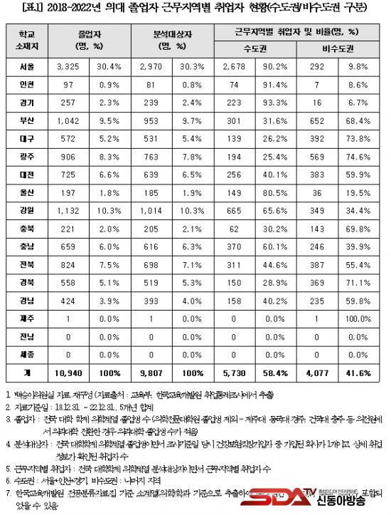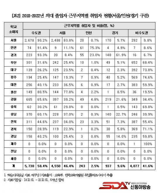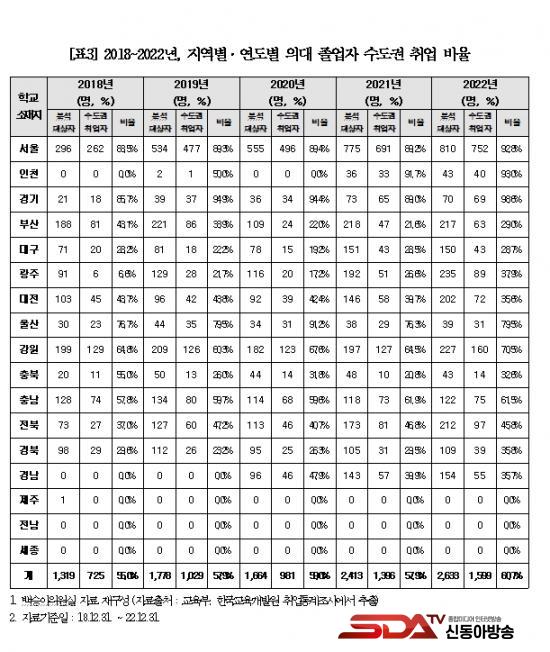 ´õºÒ¾î¹ÎÁÖ´ç ¹é½Â¾Æ ÀÇ¿ø(±¹È¸ ±³À°À§¿øÈ¸)ÀÌ ±³À°ºÎ·ÎºÎÅÍ Á¦Ãâ¹ÞÀº Àü±¹ÀÇ ÀÇ´ë Á¹¾÷»ý Ãë¾÷ ÇöȲÀ» ºÐ¼®ÇÑ °á°ú, Çб³ ¼ÒÀçÁöº°·Î ¼­¿ï 2,678¸í(90.2%), ÀÎõ 74¸í(91.4%), °æ±â 223¸í(93.3%)ÀÌ ¼öµµ±ÇÀ¸·Î Ãë¾÷Çß°í, ºñ¼öµµ±Ç ÀÇ´ë °¡¿îµ¥ ¿ï»ê 149¸í(80.5%), °­¿ø 665¸í(65.6%), Ãæ³² 370¸í(60.1%) ÀÌ ¼öµµ±Ç º´¿øÀ¸·Î Ãë¾÷ÇÑ °ÍÀ¸·Î È®ÀεǾú´Ù. [Ç¥2]