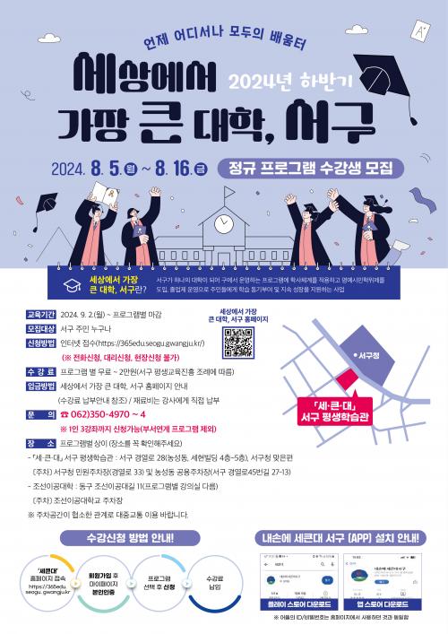 ¿î¿µ ÇÁ·Î±×·¥Àº ¡ã½Ã¹ÎÂü¿©Çаú 4°³ °úÁ¤(»î ±×¸®°í ¾Æ¸§´Ù¿î ¸¶¹«¸® Well Dying µî) ¡ãÀι®»çȸÇаú 6°³ °úÁ¤(°¨Á¤À» Àд ÁöÇýÀÇ Àι®ÇÐ, ÁÖÀÚÇаú ¾ç¸íÇÐ µî) ¡ã¹®È¿¹¼úÇаú 9°³ °úÁ¤(AI¾ÆÆ® âÀÛ ½ÇÇè½Ç, ³» Áý¿¡ ¹Ý·Á ºÐÀç µî) ¡ãÁ¶¼±À̰ø´ë Á÷¾÷Àüȯâ¾÷±³À°Çаú 5°³ °úÁ¤(À£ºù ºäƼ Äɾî, ÀÚµ¿Â÷ Áø´Ü µî)À¸·Î ÃÑ 4°³ Çаú 24°³ °ÁÂÀ̸ç 9¿ù 2ÀϺÎÅÍ ¼¼Å«´ë ¼±¸ Æò»ýÇнÀ°ü(°æ¿·Î 28, ³ó¼ºµ¿ ¼¼Çöºôµù 4Ãþ~5Ãþ) ¹× Á¶¼±À̰ø´ëÇб³¿¡¼ ÁøÇàµÈ´Ù.