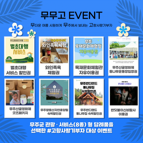 ¹«ÁÖ±º °íÇâ»ç¶û±âºÎ ´ä·ÊǰÀº ¡®¹Ýµ÷ºÒ»ç°ú¡¯¿Í ¡®Ãµ¸¶Â÷¡¯, ¡®¹ú²Ü¡¯, ¡®¸Ó·ç¿ÍÀΡ¯, ¡®¹«ÁÖ»ç¶û»óǰ±Ç¡¯ µî ÃÑ 51°³·Î ÀÌÁß °ü±¤¡¤¼ºñ½ºÇü ´ä·ÊǰÀº ¡®¹Ýµ÷ºÒÀÌ ½ÅºñŽ»ç¡¯¿Í ¡®¹úÃÊ ´ëÇà ¼ºñ½º ÇÒÀαǡ¯, ¡®¿ÍÀÎ Á·¿å üÇè±Ç¡¯, ¡®¹«ÁÖ¸ñÀç¹®ÈüÇèÀå ÀÚÀ¯ÀÌ¿ë±Ç¡¯, ¡®¹«ÁÖ»ê°ñ¿µÈÁ¦ µî³ª¹«¿îµ¿Àå ÀÔÀå±Ç¡¯,¡® ¡®¹«ÁÖ»ê°ñ¿µÈÁ¦ ±ÂÁî ÆÐŰÁö¡¯, ¡®¹«ÁÖÇâ·Î»ê ÀÚ¿¬È޾縲 ¼÷¹ÚÇÒÀαǡ¯, ¡®¹«Áֹݵ𷣵å Å볪¹«Áý ¼÷¹ÚÇÒÀαǡ¯ÀÌ ÀÖ´Ù.