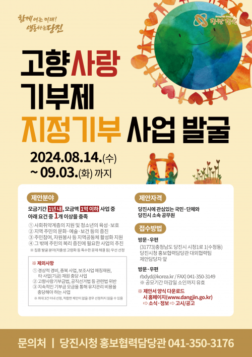 À̹ø °ø¸ðÀü¿¡ ´ëÇÑ ÀÚ¼¼ÇÑ ³»¿ëÀº ´çÁø½Ã ´©¸®ÁýÀ» Âü°íÇϰųª, ´çÁø½Ã È«º¸Çù·Â´ã´ç°ü ´ë¿ÜÇù·ÂÆÀ(¢Ï041-350-3176)¿¡ ¹®ÀÇÇÏ¸é µÈ´Ù.