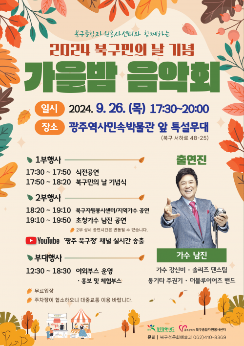 ÀÌ¾î¼ ¿¸®´Â °¡À»¹ã À½¾Çȸ ¹«´ë¿¡´Â ºÏ±¸ÀÚ¿øºÀ»ç¼¾ÅÍ, Áö¿ª °¡¼öµéÀÇ Èï°Ü¿î °ø¿¬°ú ¸ÞÀÎ ÃÊ´ë °¡¼öÀÎ ¡®³²Áø¡¯ÀÇ ¡®ÃàÇÏ °ø¿¬¡¯ÀÌ ÆîÃÄÁö¸ç Áֹε鿡°Ô °¡À»¹ã ³¶¸¸À» ¼±»çÇÒ ¿¹Á¤ÀÌ´Ù.