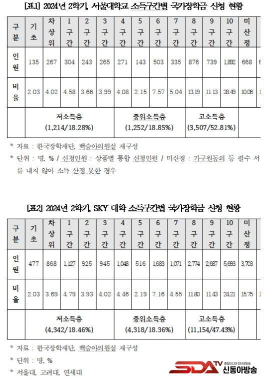 ±¹È¸ ±³À°À§¿øÈ¸ ¹é½Â¾Æ ÀÇ¿ø(´õºÒ¾î¹ÎÁÖ´ç)ÀÌ Çѱ¹ÀåÇÐÀç´ÜÀ¸·ÎºÎÅÍ Á¦Ãâ¹ÞÀº ±¹Á¤°¨»ç ÀÚ·á ¡®2024³â 2Çб⠴ëÇк° ±¹°¡ÀåÇÐ±Ý 1À¯Çü ½ÅûÀÚ ÇöȲ¡¯À» ºÐ¼®ÇÑ °á°ú, ±¹°¡ÀåÇÐ±Ý 1À¯ÇüÀ» ½ÅûÇÑ Àüü ¼­¿ï´ë ÀçÇÐÀοø 6,641¸í Áß Àý¹Ý ÀÌ»óÀÎ 3,507¸í(52.81%)ÀÌ °í¼ÒµæÃþ ÇлýÀÎ °ÍÀ¸·Î µå·¯³µ´Ù. Àú¼ÒµæÃþ ÇлýÀº 1,214¸í(18.28%)À¸·Î, °í¼ÒµæÃþ ÇлýÀÇ ¼ö´Â Àú¼ÒµæÃþ ÇлýÀÇ ¼öº¸´Ù ¾à 3¹è ´õ ¸¹¾Ò´Ù.