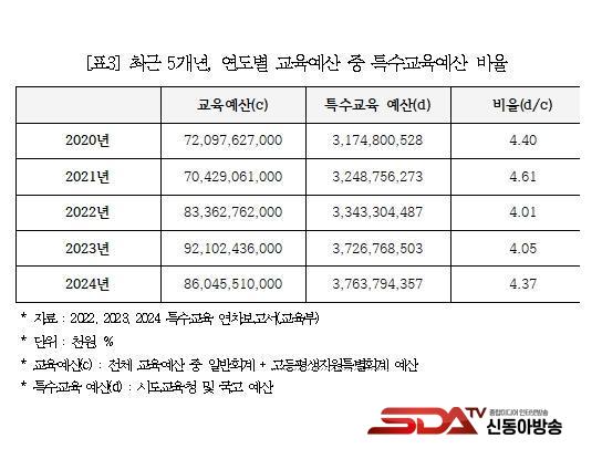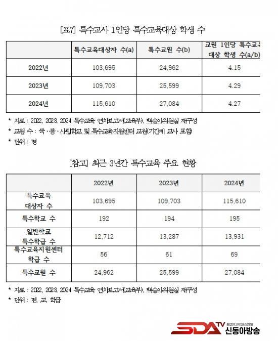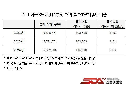 ±¹È¸ ±³À°À§¿øÈ¸ ¹é½Â¾Æ ÀÇ¿ø(´õºÒ¾î¹ÎÁÖ´ç)°ú ±³»ç³ëµ¿Á¶ÇÕ¿¬¸Í(±è¿ë¼ À§¿øÀå)ÀÌ ±¹Á¤°¨»ç ÀÚ·á ¡®2022~2024³â Ư¼ö±³À° ¿¬Â÷º¸°í¼¡¯¸¦ ºÐ¼®ÇÑ °á°ú, Àüü ÇлýÀº 2022³â 583¸¸ 451¸í, 2023³â 572¸¸ 1,731¸í, 2024³â 568¸¸ 2,016¸íÀ¸·Î °è¼Ó °¨¼ÒÇϰí ÀÖ¾ú´Ù. ¹Ý¸é¿¡ Ư¼ö±³À° ´ë»óÀÚ´Â 2022³â 10¸¸ 3,695¸í(1.78%), 2023³â 10¸¸ 9,703¸í(1.92%), 2024³â 4¿ù ±âÁØ 11¸¸ 5,610¸í(2.03%)À¸·Î ¸Å³â Áõ°¡ Ãß¼¼¿´´Ù. 2020³â 9¸¸ 5,420¸í, 2021³â 9¸¸ 8,154¸íÀ̾ú°í, 5³â »õ Çлý Áõ°¡À²ÀÌ 21.2%¿¡ ´ÞÇß´Ù.