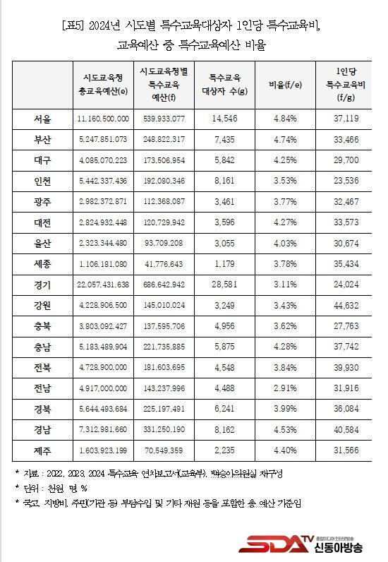 Ư¼ö±³À° ¿¹»êÀº Áö¿ªº°·Îµµ Å« °ÝÂ÷¸¦ º¸¿´´Ù. Ư¼ö±³À°´ë»óÀÚ 1ÀÎ´ç ±³À°ºñ°¡ ¸¹Àº Áö¿ªÀº °¿ø 4,463¸¸¿ø, °æ³² 4.058¸¸¿øÀ̰í, ÀûÀº Áö¿ªÀº ÀÎõ 2,353¸¸¿ø, °æ±â 2,402¸¸¿ø ¼øÀ̾ú´Ù. ¶ÇÇÑ ½Ãµµ±³À°Ã»º° Ãѱ³À°¿¹»ê Áß Æ¯¼ö±³À°¿¹»ê ºñÁßÀÌ Å« °÷Àº ¼¿ï 4.84%, ºÎ»ê 4.73%, ÀÛÀº °÷Àº Àü³² 2.91%, °æ±â 3.11%·Î ³ªÅ¸³µ´Ù.