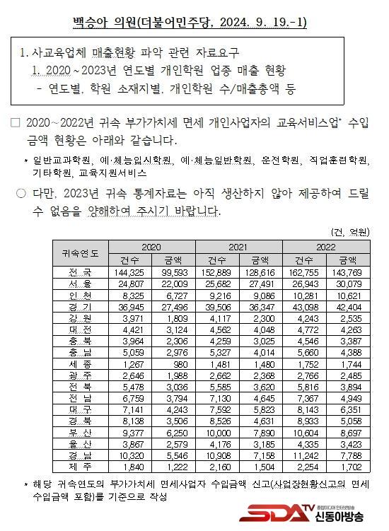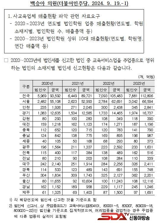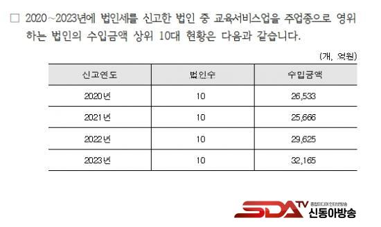 ±¹È¸ ±³À°À§¿øÈ¸ ¹é½Â¾Æ ÀÇ¿ø(´õºÒ¾î¹ÎÁÖ´ç)ÀÌ ±¹¼¼Ã»À¸·ÎºÎÅÍ ¹ÞÀº ±¹Á¤°¨»ç ÀÚ·á ¡®2020~2023³â ±³À°¼­ºñ½º¾÷ ¹ýÀÎ ¼öÀÔ ÇöȲ¡¯¿¡ µû¸£¸é »ç±³À°¾÷ü ¹ýÀÎ ÃѸÅÃâÀº 2020³â 9.3Á¶¿ø, 2021³â 8.9Á¶¿ø, 2022³â 10.5Á¶¿ø, 2023³â 11.2Á¶¿øÀ¸·Î °è¼Ó Áõ°¡Çϰí ÀÖÀ¸¸ç, À۳⿡ ¿ª´ë ÃÖ°íÄ¡¸¦ ±â·ÏÇÑ °ÍÀ¸·Î ÆÄ¾ÇµÆ´Ù. ¶ÇÇÑ »ç±³À°¾÷ü ¹ýÀÎ ¼öµµ 2023³â 7,881°³·Î 2020³â 5,969°³ ´ëºñ 32.0% Áõ°¡ÇßÀ¸¸ç ÃÖ±Ù ²ÙÁØÈ÷ Áõ°¡Çß´Ù.