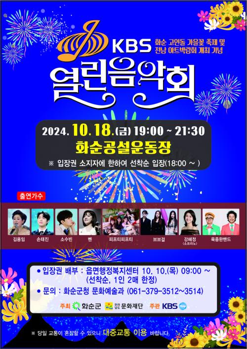 [½Åµ¿¾Æ¹æ¼Û=·ù¾ð¿­±âÀÚ] È­¼ø±º(±º¼ö ±¸º¹±Ô)Àº ¿À´Â 10¿ù 18ÀÏ(±Ý) ¿ÀÈÄ 7½Ã È­¼ø °ø¼³¿îµ¿Àå Æ¯¼³¹«´ë¿¡¼­ ¡®È­¼ø °íÀε¹ °¡À»²É ÃàÁ¦ ¹× Àü³² ¾ÆÆ®¹Ú¶÷ȸ ART 061¡¯À» ±â³äÇϱâ À§ÇÑ ¡®È­¼ø±º¹Î°ú ÇÔ²²ÇÏ´Â KBS ¿­¸°À½¾Çȸ¡¯¸¦ °³ÃÖÇÑ´Ù°í ¹àÇû´Ù.