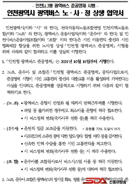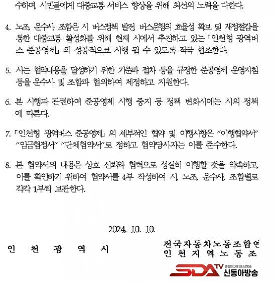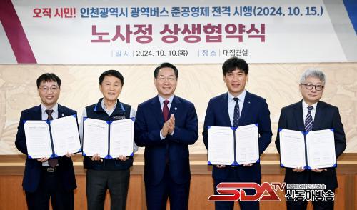 »çÁø=À¯Á¤º¹ ÀÎõ±¤¿ª½ÃÀåÀÌ 10ÀÏ ½Ãû Á¢°ß½Ç¿¡¼­ ¿­¸° 'ÀÎõ±¤¿ª½Ã ±¤¿ª¹ö½º Áذø¿µÁ¦ Àü°Ý½ÃÇà(2024.10.15) ³ë»çÁ¤ »ó»ýÇù¾à½Ä'¿¡¼­ Çù¾à´ç»çÀÚµé°ú ±â³äÃÔ¿µÀ» Çϰí ÀÖ´Ù. (¿ÞÂʺÎÅÍ ±èÀμö ÀÎõ½Ã ±³Åë±¹Àå, ±è¼ºÅ Àü±¹ÀÚµ¿Â÷³ëµ¿Á¶ÇÕ¿¬¸Í ÀÎõÁö¿ª³ëµ¿Á¶ÇÕ À§¿øÀå, À¯Á¤º¹ ÀÎõ½ÃÀå, ¹Ú¼öÀÀ ÀÎõ±¤¿ª½Ã ±¤¿ª¹ö½º¿î¼Û»ç¾÷ÀÚ ´ëÇ¥, ±èÅÂÀÎ ÀÎõ±¤¿ª½Ã¹ö½º¿î¼Û»ç¾÷Á¶ÇÕ ¼ö¼®ºÎÀÌ»çÀå)