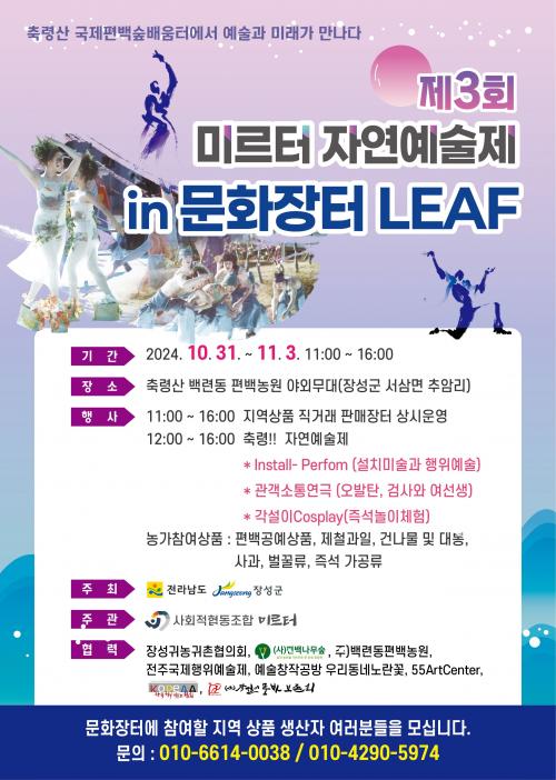 Àü¶ó³²µµ¿Í À强±ºÀÌ ÁÖÃÖÇϰí À强Áö¿ª »çȸÀûÇùµ¿Á¶ÇÕ ¹Ì¸£ÅͰ¡ ÁÖ°üÇÏ´Â À̹ø ÀÚ¿¬¿¹¼úÁ¦´Â ¡®À强ÀÇ ÀÚ¶û¡¯ Ãà·É»ê Æí¹é½£À» ¹è°æÀ¸·Î ÆîÃÄÁö´Â ¹®È‧¿¹¼ú Ç⿬ÀÌ´Ù. ¼³Ä¡‧ÇàÀ§¿¹¼ú°ú °ü°´¼ÒÅ뿬±Ø, âÀÛ¹«¿ë µî Æò¼Ò ½±°Ô Á¢Çϱâ Èûµç °ø¿¬ÀÌ ³ªÈê µ¿¾È ÆîÃÄÁ® °ü°´µé¿¡°Ô ÀÌ»öÀûÀÎ °¨ÈïÀ» ¼±»çÇÒ ¿¹Á¤ÀÌ´Ù.