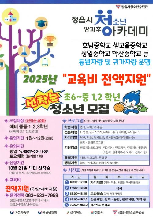 ½ÅÀÔ»ý ¸ðÁý ´ë»óÀº 2025³â ¿¹ºñ Áß1(ÇöÀç ÃʵîÇб³ 6Çгâ)ºÎÅÍ ÁßÇб³ 1, 2Çгâ ÇлýÀÌ´Ù. ¾ÆÄ«µ¥¹Ì¿¡¼´Â ¸ÂÃãÇü ÇÁ·Î±×·¥À» ÅëÇØ ´Ù¾çÇÑ Ä£±¸µéÀÌ ÇÔ²² ¾î¿ï¸®¸ç ¼ºÀåÇÒ ¼ö ÀÖµµ·Ï µ½´Â´Ù. ÇлýµéÀÇ ¾ÈÀüÇÑ ÇнÀ ȯ°æÀ» À§ÇØ µî¿ø°ú ±Í°¡ Â÷·®ÀÌ Áö¿øµÇ¸ç, ¹«»ó±Þ½Ä°ú ÇÔ²² ÆòÀÏ ¿ÀÈÄ 4½Ã 30ºÐºÎÅÍ Àú³á 8½Ã 30ºÐ±îÁö ¿î¿µµÈ´Ù.
