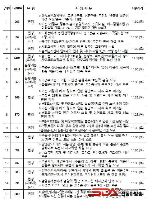 ÀÎõ½Ã °ü°èÀÚ´Â À̹ø Á¶Á¤À» ÅëÇØ ¡ã´ë±Ô¸ð ¾ÆÆÄÆ®´ÜÁö Á¶¼ºÁö¿ª¿¡ ³ë¼± È®Ãæ(1, 14, 67-1, 518, 4401¹ø) ¡ã¿î¼öÁ¾»çÀÚ ±Ù·Î¿©°Ç °³¼± ¹× ¾ÈÀü¼º °­È­(26, 78, 86, 569, 570¹ø) ¡ãÁöÇÏö¿ª ¿¬°è, ½Â°´ °ú¼Ò ¹× ¿îÇà ºÒÇÕ¸® ±¸°£À» Á¤ºñ(206, 565, 583, 591, 800¹ø)ÇÏ¿© ¹ö½º ¿îÇàÀÇ ¾ÈÁ¤¼ºÀ» °­È­Çϰí È¿À²¼ºÀ» µµ¸ðÇÒ ¼ö ÀÖÀ» °ÍÀ̶ó°í ¹àÇû´Ù.