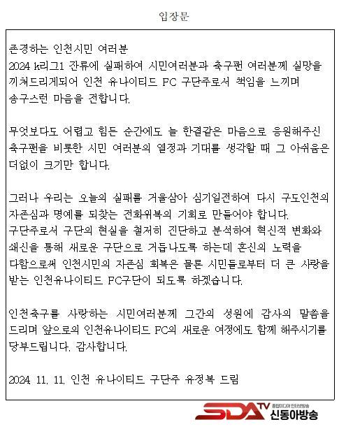 [½Åµ¿¾Æ¹æ¼Û ÀÎõ= À±¹Î½Ä±âÀÚ] ÀÎõÀ¯³ªÀÌÆ¼µå FCÀÇ ±¸´ÜÁÖ À¯Á¤º¹ ÀÎõ±¤¿ª½ÃÀåÀº ÀÎõÀ¯³ªÀÌÆ¼µå FC°¡ 2024 K¸®±×1 ÀÜ·ù¿¡ ½ÇÆÐÇÑ °Í°ú °ü·ÃÇØ ÀÎõ½Ã¹Î°ú Ã౸ ÆÒ ¿©·¯ºÐ²² ±íÀº »ç°ú¿Í ÇÔ²² ÀÔÀåÀ» ¹ßÇ¥Çß´Ù.