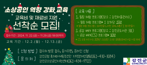 ÀÌ ÇÁ·Î±×·¥Àº °Áø±º¿¡ °ÅÁÖÇÏ´Â ¼Ò»ó°øÀΰú ¿¹ºñâ¾÷ÀÚ 90¸íÀ» ´ë»óÀ¸·Î Çϸç, Âü°¡ÀÚÀÇ ±³À°ºñ ¹× Àç·áºñ¸¦ Áö¿øÇϱ⠶§¹®¿¡ ÀںδãÀÌ ¾ø´Ù. ±³À° °úÁ¤Àº °æ¿µ °¡Ä¡°ü ±³À°ºÎÅÍ ½Ã±×´Ïó üÇè ÇÁ·Î±×·¥, CS ±³À°±îÁö ´Ù¾çÇÏ°Ô ±¸¼ºµÅ ÀÖ¾î ½ÇÁúÀûÀÎ µµ¿òÀ» Á¦°øÇÒ ¿¹Á¤ÀÌ´Ù.