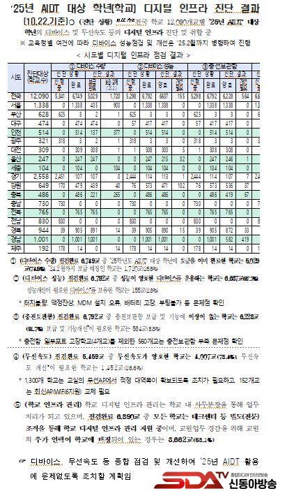¡à ±¹È¸ ±³À°À§¿øÈ¸ ¹é½Â¾Æ ÀÇ¿ø(´õºÒ¾î¹ÎÁÖ´ç)ÀÌ °ø°³ÇÑ ¡°2025³â AIDT ´ë»óÇгâ(Çб³) µðÁöÅÐ ÀÎÇÁ¶ó 1Â÷ Áø´Ü°á°ú¡±¿¡ µû¸£¸é, Àüü Áø´Ü´ë»ó Çб³ 12,090±³ Áß ¹«¼±¼Óµµ 1Â÷ Á¡°ËÀÌ ¿Ï·áµÈ Çб³´Â 5,459±³(45.2%)À̰í ÀÌÁß ¹«¼±¼Óµµ °³¼±ÀÌ ÇÊ¿äÇÑ Çб³´Â 1,452±³(26.6%)¿´´Ù. 1,300°³ Çб³´Â ±³½ÇÀÇ ¹«¼±AP¿¡¼ ÀûÁ¤ ´ë¿ªÆøÀÌ È®º¸µÇµµ·Ï Á¶Ä¡°¡ ÇÊ¿ä, 152°³±³´Â ÃÖ½ÅAP(WiFi6Áö¿ø)·Î ±³Ã¼ÇØ¾ß ÇÏ´Â »óȲÀÌ´Ù.