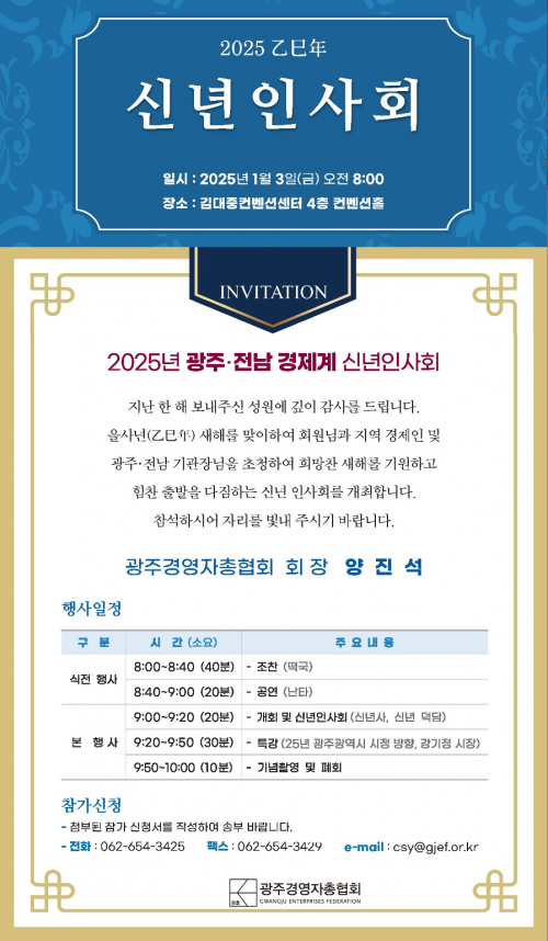 25³â °æÁ¦°è ½Å³âÀλçȸ´Â ù ¹øÂ°·Î °³ÃֵǴ Çà»ç·Î ±¤ÁÖ․Àü³² ÁöÀÚüÀå°ú ±â°üÀå ¹× Á¤Àç°è ÀλçµéÀÌ ´ë°Å Âü¼®ÇÒ ¿¹Á¤À̸ç, Âü¼®À» Èñ¸ÁÇÏ´Â ±â°ü ¶Ç´Â ´Üü¿Í ±â¾÷Àº Âü°¡½Åû¼¸¦ ±¤ÁÖ°æÃÑ »ç¹«±¹À¸·Î Á¦ÃâÇØ¾ß ÇÑ´Ù.