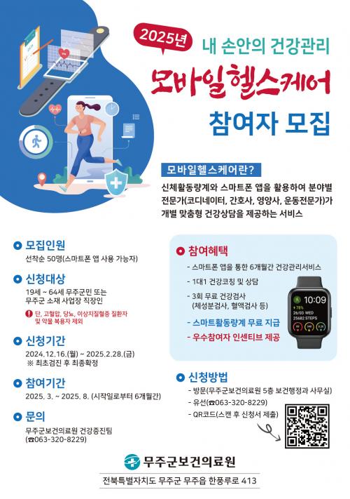 19~64¼¼ ¹«ÁÖ±º¹Î ¶Ç´Â ¹«ÁÖ±º ¼ÒÀç »ç¾÷Àå¿¡ ÀçÁ÷ ÁßÀÎ Á÷ÀåÀÎÀ̶ó¸é ´©±¸³ª Âü¿©ÇÒ ¼ö ÀÖÀ¸¸ç ¹«ÁÖ±ºº¸°ÇÀÇ·á¿ø(º¸°ÇÇàÁ¤°ú °Ç°ÁõÁøÆÀ)À¸·Î ¹æ¹® ¶Ç´Â ÀüÈ(063-320-8229), QRÄڵ带 ÅëÇØ ½ÅûÇÏ¸é µÈ´Ù.