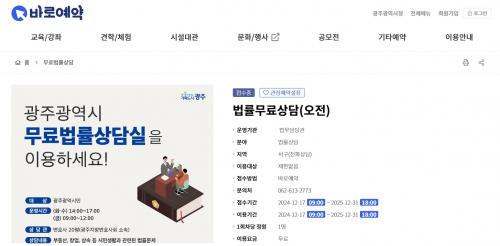 ±¤Áֽà ¹«·á ¹ý·ü»ó´ãÀº È¿äÀÏ¡¤¼ö¿äÀÏ ¿ÀÈÄ 2½ÃºÎÅÍ 5½Ã±îÁö, ±Ý¿äÀÏ ¿ÀÀü 9½ÃºÎÅÍ 12½Ã±îÁö·Î ¸ÅÁÖ 3ȸ »çÀü ¿¹¾àÁ¦·Î ¿î¿µµÈ´Ù. »ó´ã½Ã°£Àº 1Àδç 20ºÐ Á¤µµ´Ù. ¹Î»ç¡¤Çü»ç¡¤°¡»ç µî ´Ù¾çÇÑ ºÐ¾ßÀÇ ¹ý·ü¹®Á¦¿¡ ´ëÇØ ±¤ÁÖÁö¹æº¯È£»çȸ ¼Ò¼Ó º¯È£»çÀÇ »ó´ãÀ» ¹«·á·Î ¹ÞÀ» ¼ö ÀÖ´Ù.