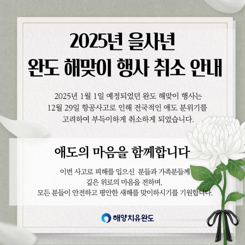 12¿ù 29ÀÏ ¹ß»ýÇÑ ¹«¾È°øÇ× Ç×°ø±â »ç°í¿¡ µû¸¥ Àü±¹ÀûÀÎ ¾Öµµ ºÐÀ§±â¸¦ °í·ÁÇϰí À¯°¡Á·À» ¹è·ÁÇϱâ À§ÇØ ÇØ¸ÂÀÌ ÇÁ·Î±×·¥°ú Çà»ç¸¦ Ãë¼ÒÇϱâ·Î °áÁ¤Çß´Ù.