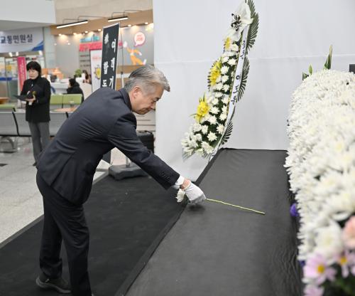 [½Åµ¿¾Æ¹æ¼Û=ÀÌÁöÇö±âÀÚ] ±¤ÁÖ ¼±¸(±¸Ã»Àå ±èÀ̰)´Â 30ÀÏ ¼±¸Ã» ·Îºñ¿¡¼ Á¦ÁÖÇ×°ø ¿©°´±â Âü»ç ÇÕµ¿ ºÐÇâ¼Ò¸¦ ¸¶·ÃÇϰí Èñ»ýÀÚµéÀÇ ³ÌÀ» ±â·È´Ù. ¼±¸´Â ¾Öµµ±â°£ÀÎ ´ÙÀ½ ´Þ 4ÀϱîÁö ºÐÇâ¼Ò¸¦ ¿î¿µÇÒ ¿¹Á¤ÀÌ´Ù. ¶ÇÇÑ Á¾¹«½Ä ¹× ÇØ¸ÂÀÌ Çà»ç µî ¿¬¸»¿¬½Ã Çà»ç¸¦ Ãë¼ÒÇß´Ù.