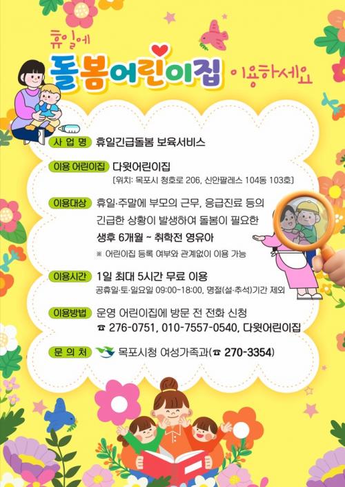 ÈÞÀϱä±Þµ¹º½ ¾î¸°ÀÌÁýÀº ¾çÀ°ÀÚ°¡ ÁÖ¸»À̳ª °øÈÞÀÏ¿¡ ±ä±ÞÇÑ »óȲÀÌ ¹ß»ýÇßÀ» ¶§ ¾î¸°ÀÌÁý¿¡¼ ¾ÆÀ̸¦ µ¹ºÁÁÖ´Â ¼ºñ½º·Î, ½Ã´Â Áö³ ÇØ 7¿ùºÎÅÍ ºÏÇ×µ¿ ¼ÒÀç ´ÙÀ¾î¸°ÀÌÁýÀ» ¼±Á¤ÇØ ¿î¿µÇϰí ÀÖ´Ù.