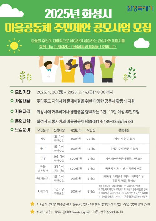 ¡®2025³â ¸¶À»°øµ¿Ã¼ ÁÖ¹ÎÁ¦¾È °ø¸ð»ç¾÷¡¯Àº ÁֹΠ½º½º·Î ¸¶À»¹®Á¦¸¦ Á÷Á¢ ¹ß°ßÇϰí ÇØ°áÇÏ´Â °úÁ¤À» ÅëÇØ °øµ¿Ã¼ ÀǽÄÀ» ÇÔ¾çÇϰí Áö¿ª»çȸÀÇ ´Ù¾çÇÑ º¯È¸¦ À̲ø¾î ³¾ ¼ö ÀÖµµ·Ï Áö¿øÇÏ´Â »ç¾÷ÀÌ´Ù.